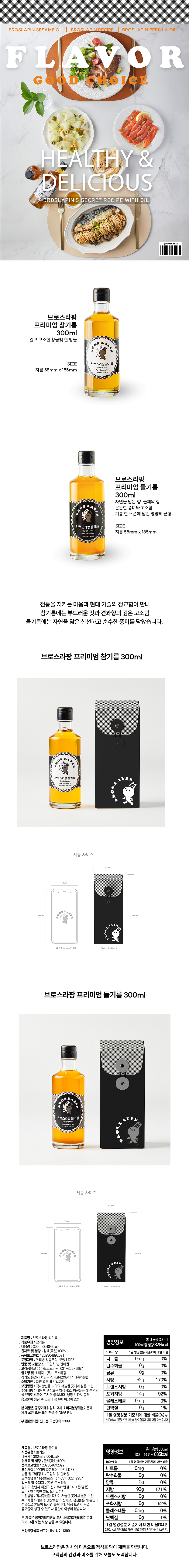 | 들기름 | 총 내용량 300ml 100ml 당 함량 835kcal |